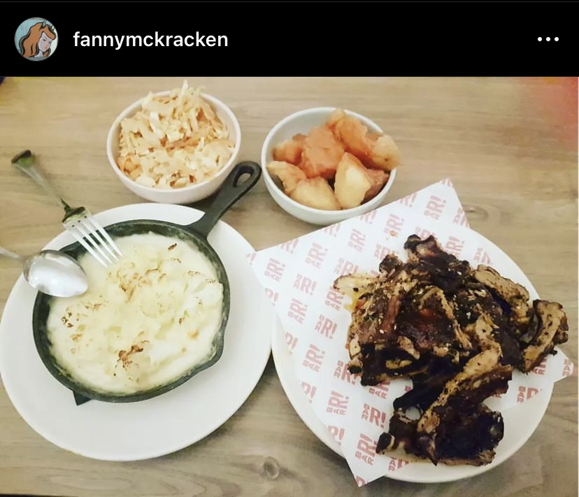 Delicious ribs cooked over charcoal, spicy coleslaw, potatoes & cheesy cauliflower.
